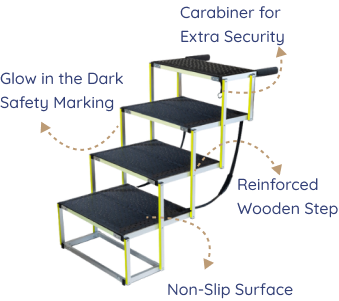 Nuestras escaleras para perros son la ayuda perfecta para perros grandes, pequeños, enfermos y mayores. La solución ideal para problemas articulares y de espalda en perros y sus dueños. Nuestra escalera ligera cuenta con un asa para facilitar su transporte.