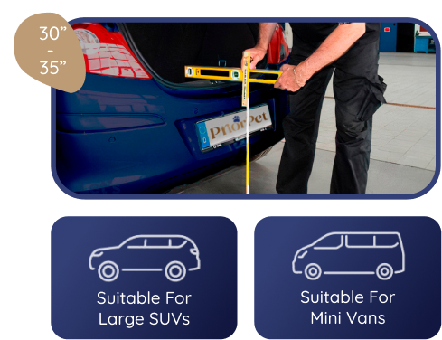 Para SUV grandes o camionetas de cabina cuádruple con caja estándar, nuestra plataforma de embarque ajustable se adapta a la altura de su vehículo, de 76 a 89 cm. Los extremos de goma protegen la pintura. Consulte la foto para saber cómo medir la parte trasera de su vehículo.