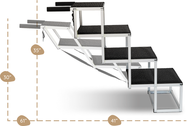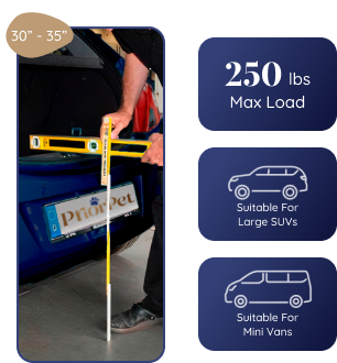 Nuestra escalera para perros se adapta a coches pequeños y es apta para perros de cualquier tamaño. La altura se puede ajustar de 76 a 89 cm.